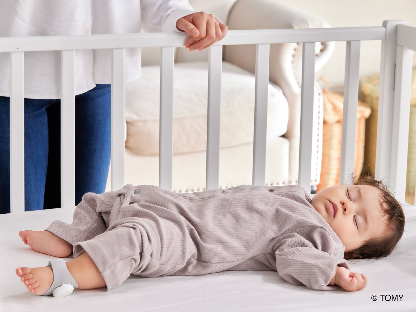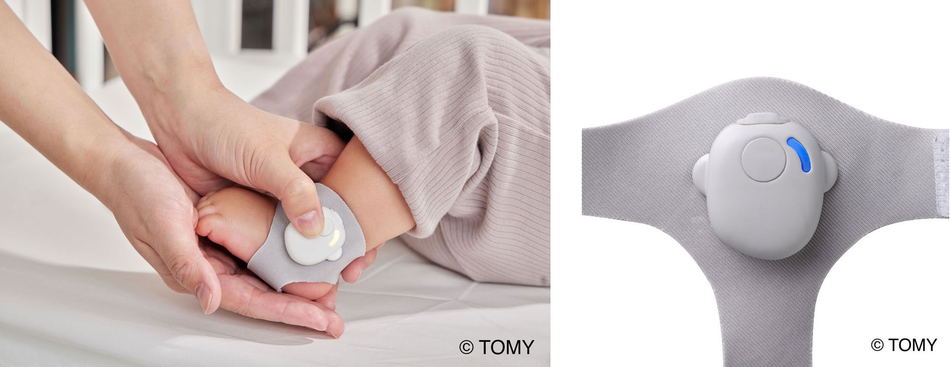 赤ちゃんの足に取り付けてボタンを押すだけで動作し、本体LEDの色で「抱っこで歩く」「ベッドに寝かせる」など、そのときに最適な育児行動をお知らせし、スムーズな寝かしつけをサポートします。