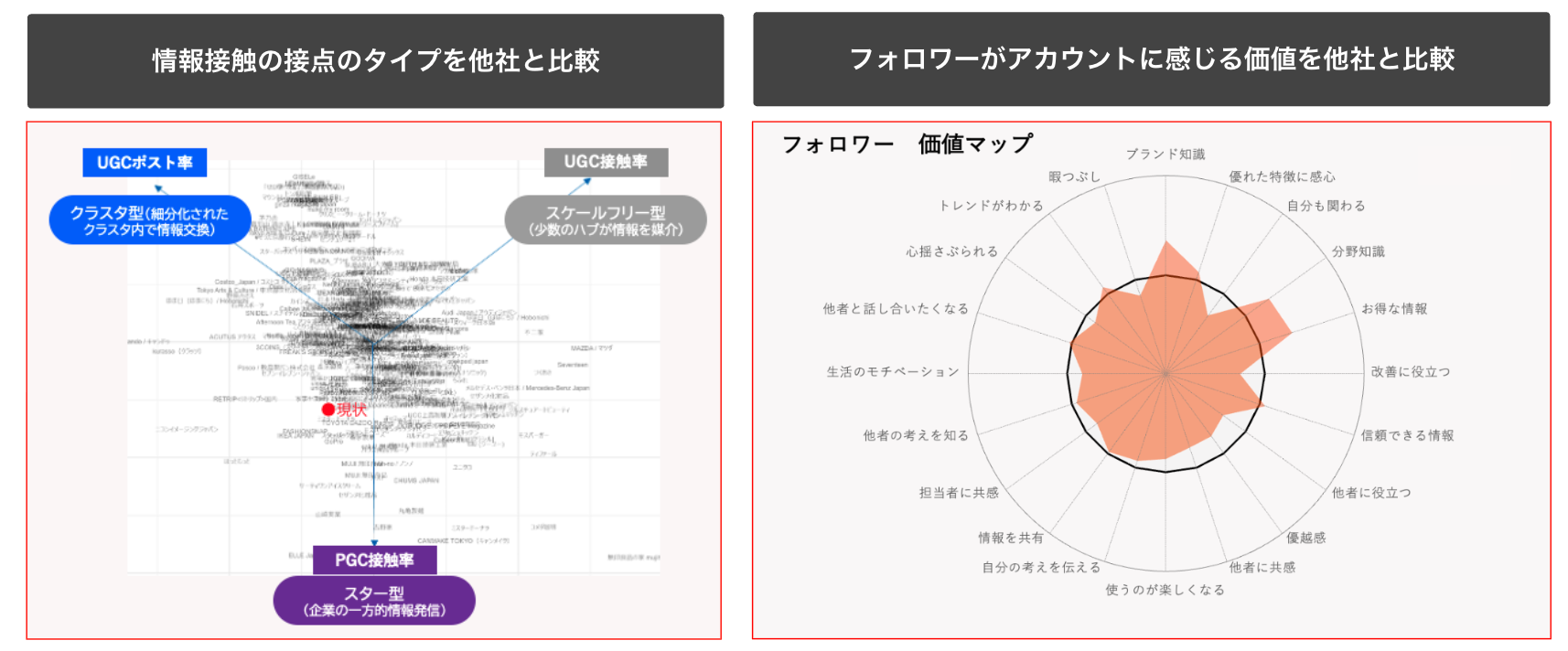 本調査では、フォロワーへの定量調査と独自データベースを組み合わせることで、ブランドが「どのような価値で支持されているのか」「どのような構造で情報が広がっているのか」を明らかにし、アカウントの現在地を相対的に把握することを可能にします。