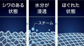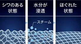 衣類のシワの原因は、絡みついたまま乾燥した繊維。衣類スチーマーで、水分を与えて「ほぐす」ことでシワをのばします。シワのばしのポイントは繊維の奥までしっかり水分を浸透させること。スチーム量が多いほど浸透効果は高まり、スチームが繊維の奥までしっかり浸透し、繊維がほぐれシワがのびやすくなります。