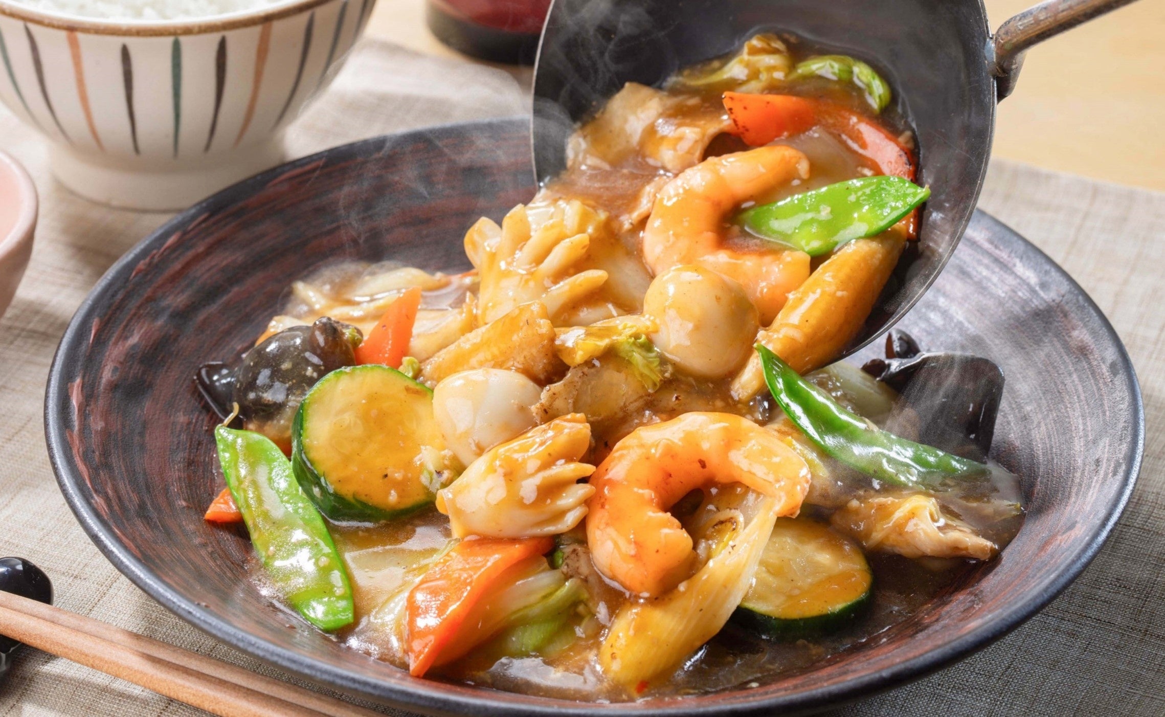 使用食材は豚肉、イカ、えび、うずらの卵、人参、長ネギ、白菜、きくらげ、ズッキーニ、ヤングコーン 、絹さやの11種。様々な食材の旨みを堪能できる一品です。味のベースはオイスターソース。隠し味の醤油麹とゆずがほのかに香る、大戸屋らしい味付けでご飯が進む『八宝菜』です。