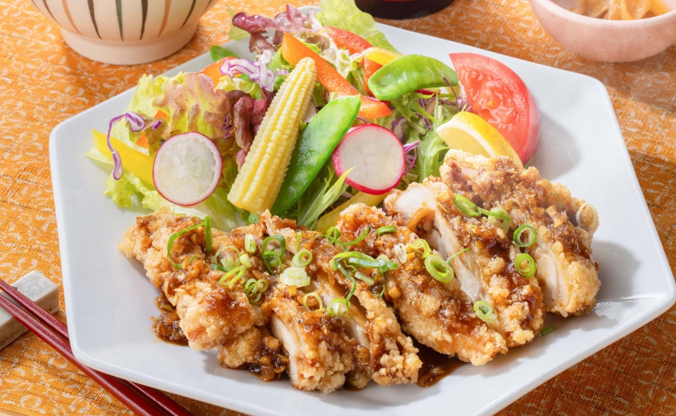 刻みネギやごま油、隠し味に塩麹を使った店内仕込みの油淋鶏ダレは、フレッシュな香りとさわやかな酸味で食欲をそそります。彩り華やかな季節野菜のサラダは、油淋鶏との相性抜群。健康的でさっぱり食べられる絶品『油淋鶏』です。