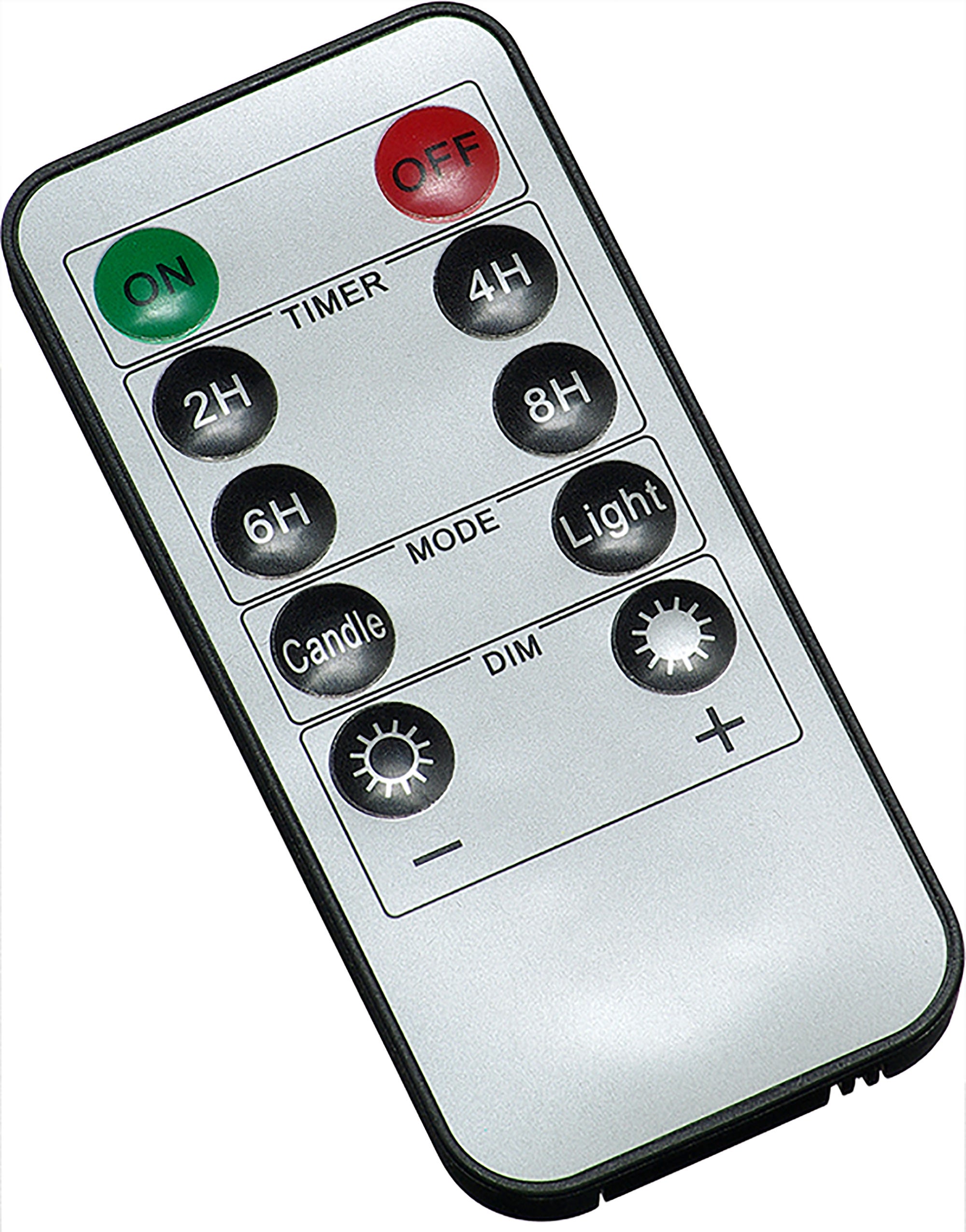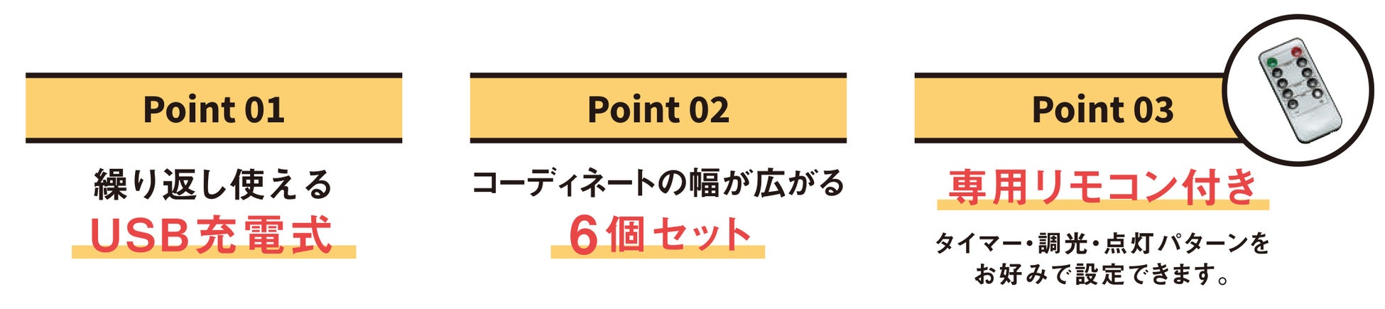 専用のリモコンが付属しているので、複数同時に「ON/OFF」できるのはもちろん、4種類の「タイマー」、明るさのレベルを選べる「調光」、キャンドルのようなゆらぐあかりと常時点灯を選べる「点灯パターン」をお好みで設定できる多機能なところもポイントです。