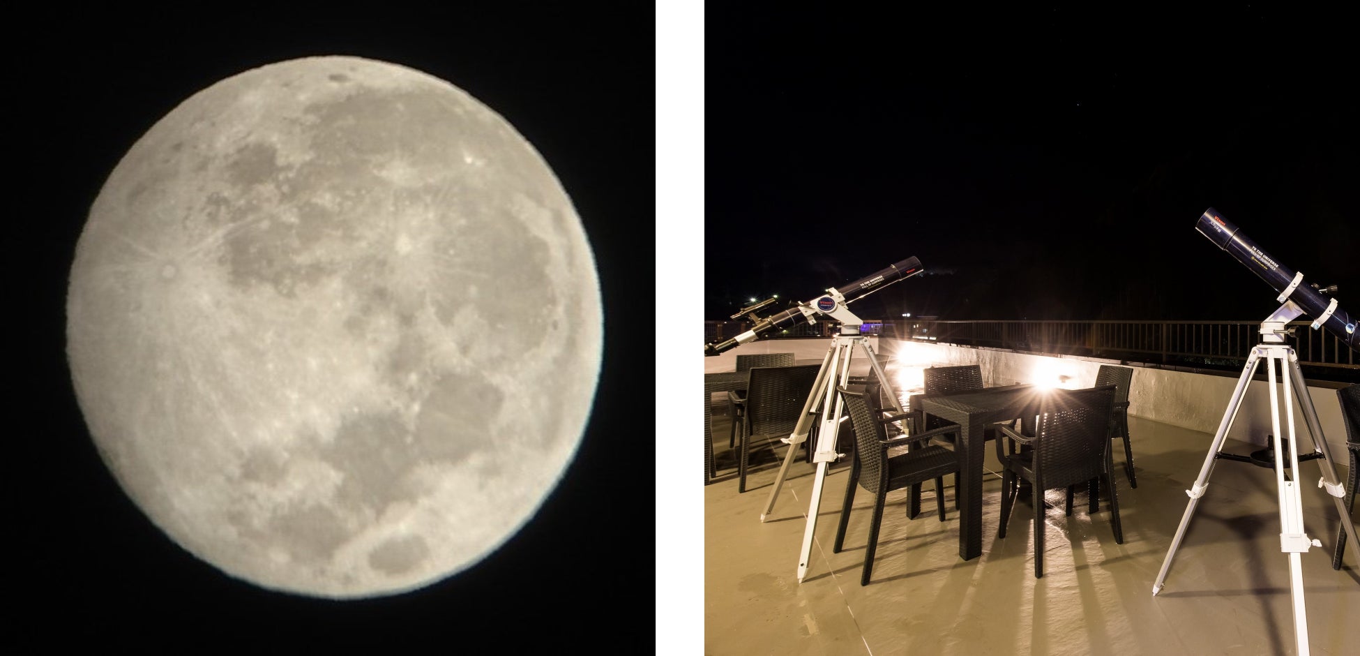 満月の夜、テラスに天体望遠鏡が用意されます。