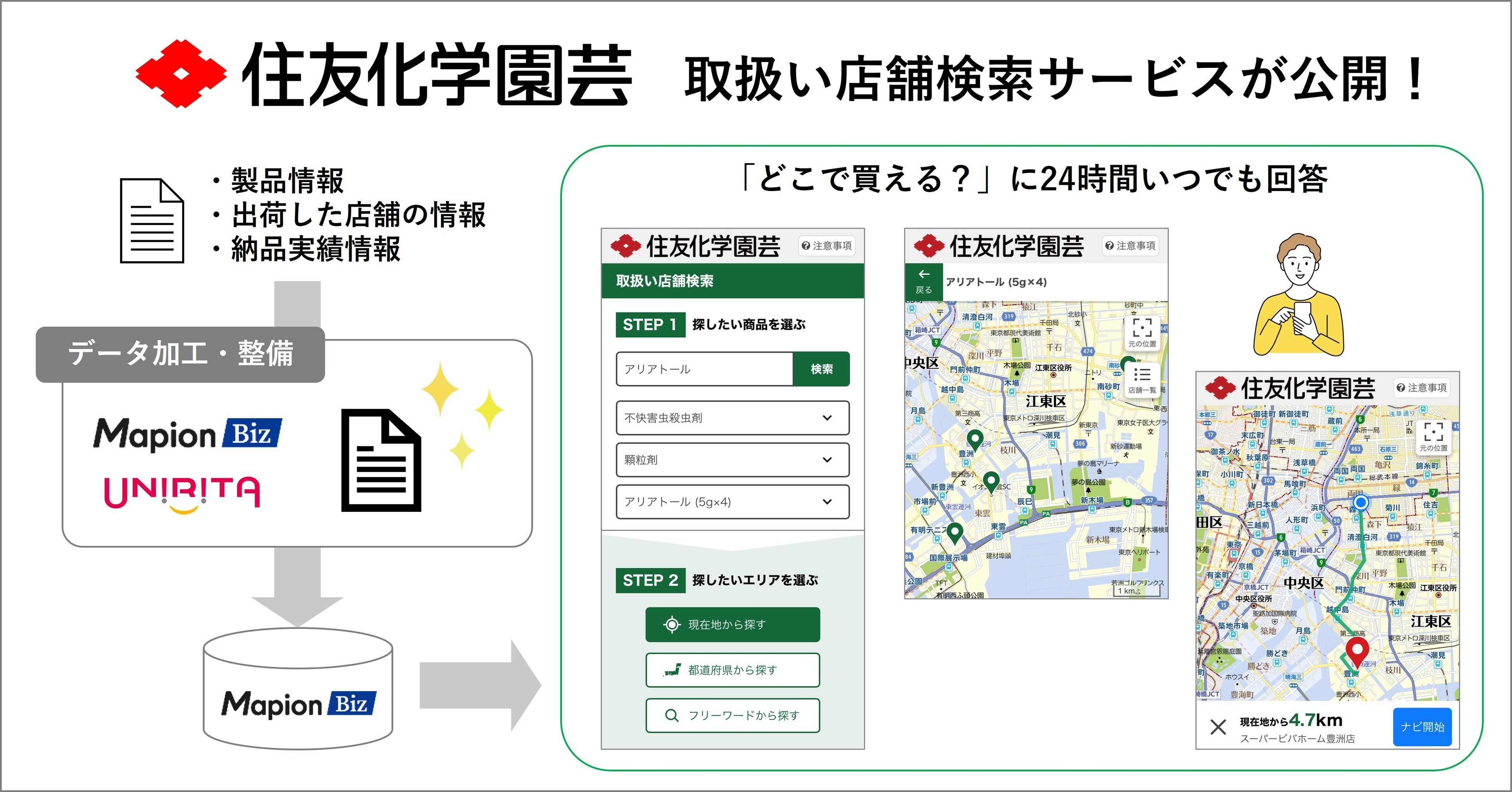 凸版印刷株式会社のグループ会社であり暮らしの身近なインターネットサービスを展開する株式会社ONE COMPATH(ワン・コンパス)は、地図ソリューションサービス「MapionBiz」の「取扱い店舗検索」サービスを、家庭園芸用薬品・肥料・資材等の製造販売を行う住友化学園芸株式会社に提供し、企業サイト(https://sc-engei.mapion.co.jp/b/sc_engei/)に導入されました。顧客が求める商品をどの店舗で購入できるか、待たせることなく24時間いつでも案内ができるようになりました。