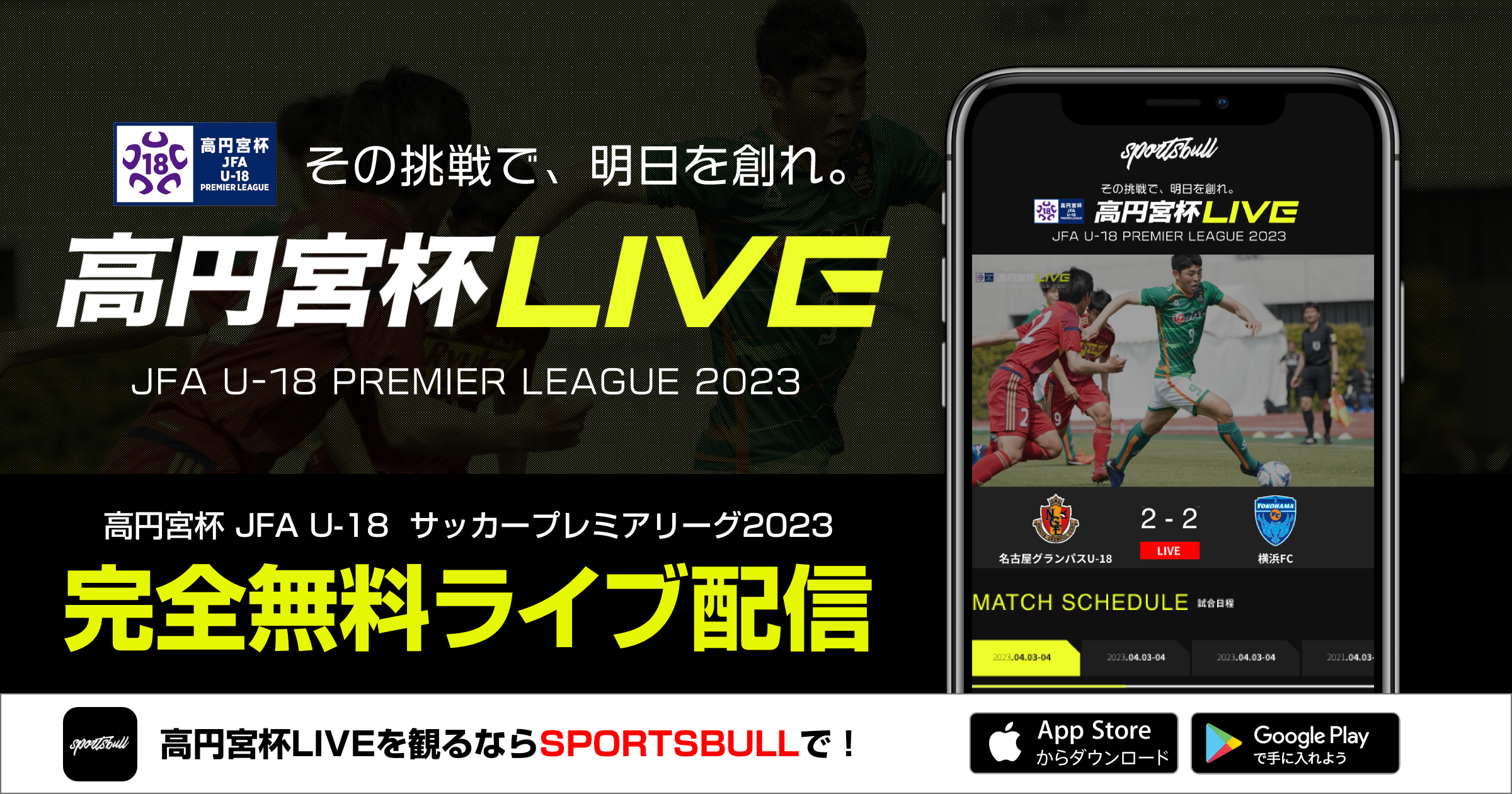 株式会社運動通信社(本社:東京都港区、代表取締役社長:黒飛功二朗 以下、運動通信社)は、公益財団法人日本サッカー協会(本社:東京都文京区、会長:田嶋幸三 以下、JFA)が主催する高校世代最強を決める熱きリーグ戦「高円宮杯 JFA U-18サッカープレミアリーグ 2023」を運動通信社が運営するスポーツメディア「SPORTS BULL(スポーツブル)」にて、無料LIVE配信します。