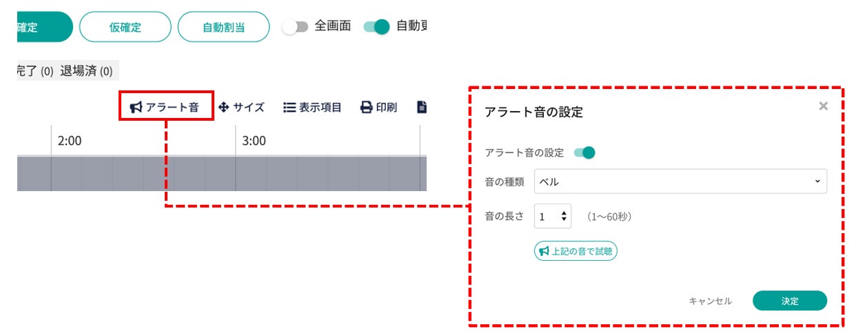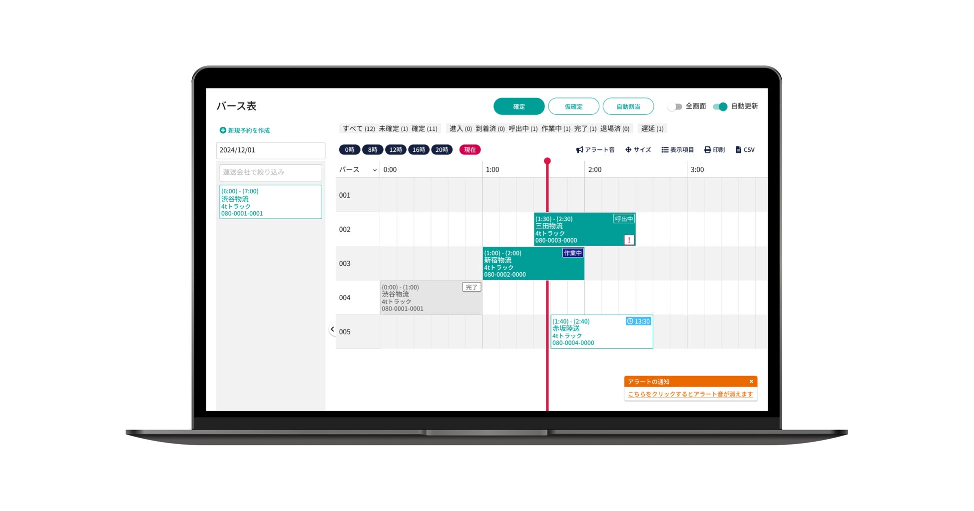 アラートを出す条件を、各現場の運用に合わせて柔軟に設定可能です。例えば、予約時刻を過ぎても車両が到着していない場合や、特定の状態が一定時間続いた場合に通知するなど、現場の状況に応じたルールで対応が可能です。また、必要に応じて通知を無効化することもできます。