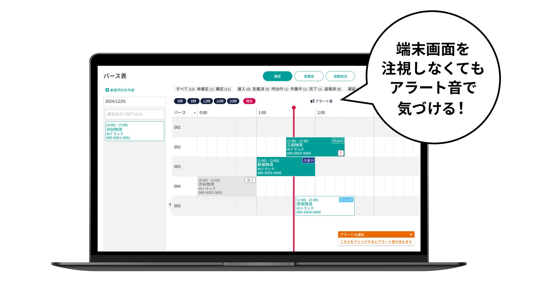 車両が到着した際や、作業が着手されていない際にアラート音で通知することで、端末画面を注視していなくても重要な変化を作業担当者に伝えます。