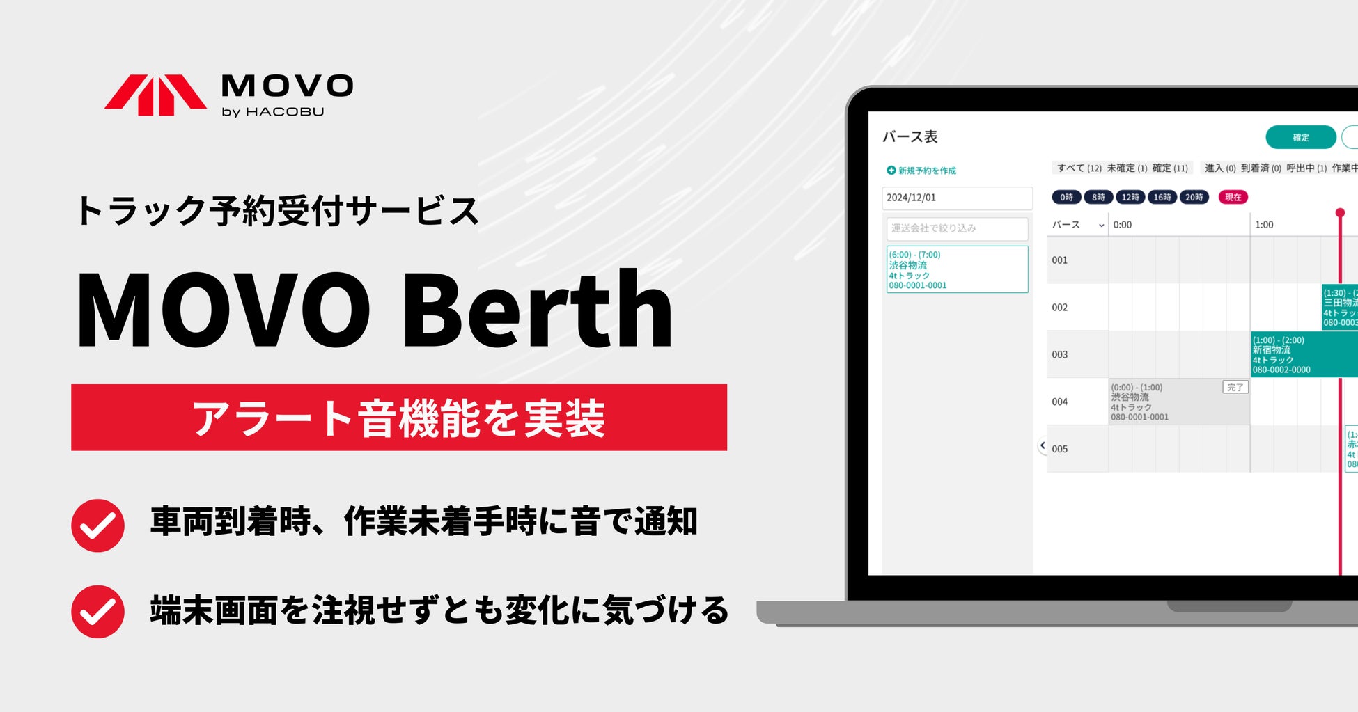 Hacobu、トラック予約受付サービス「MOVO Berth」にアラート音機能を実装! 端末画面を注視せずとも物流現場の変化を把握可能に