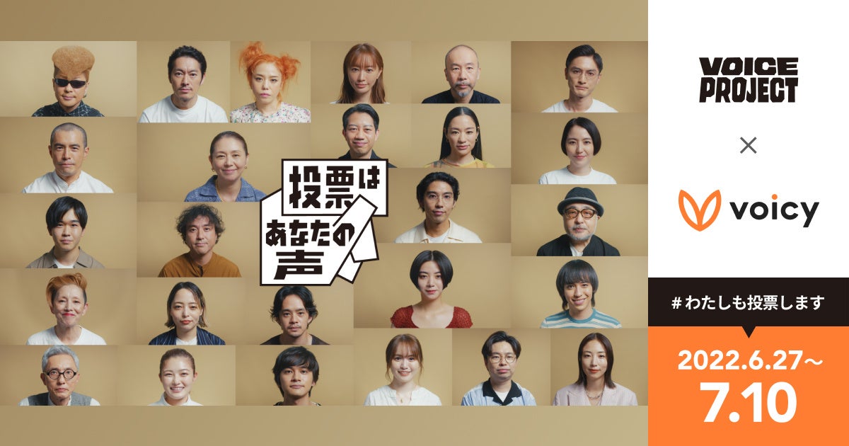 株式会社Voicyは開発・運営する音声プラットフォームVoicyで、7月10日(日)に控える参議院選挙2022の投票日に向けて、VOICE PROJECTと連携した取り組みを実施します。6月27日(月)より行うトークテーマ特集「#わたしも投票します」では、パーソナリティがそれぞれの視点で語る放送が集まります。VOICE PROJECTのVoicyチャンネルも登場し、投票参加について考えることのできる2週間をお届けします。