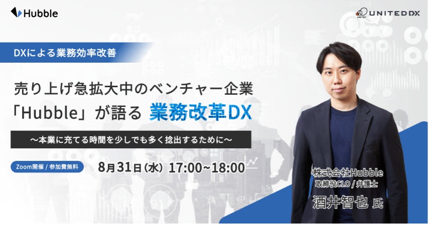 ウェビナー「売り上げ急拡大中のベンチャー企業「Hubble」が語る、 業務改革DX~本業に充てる時間を少しでも多く捻出するために~」 8月31日(水)17:00〜開催