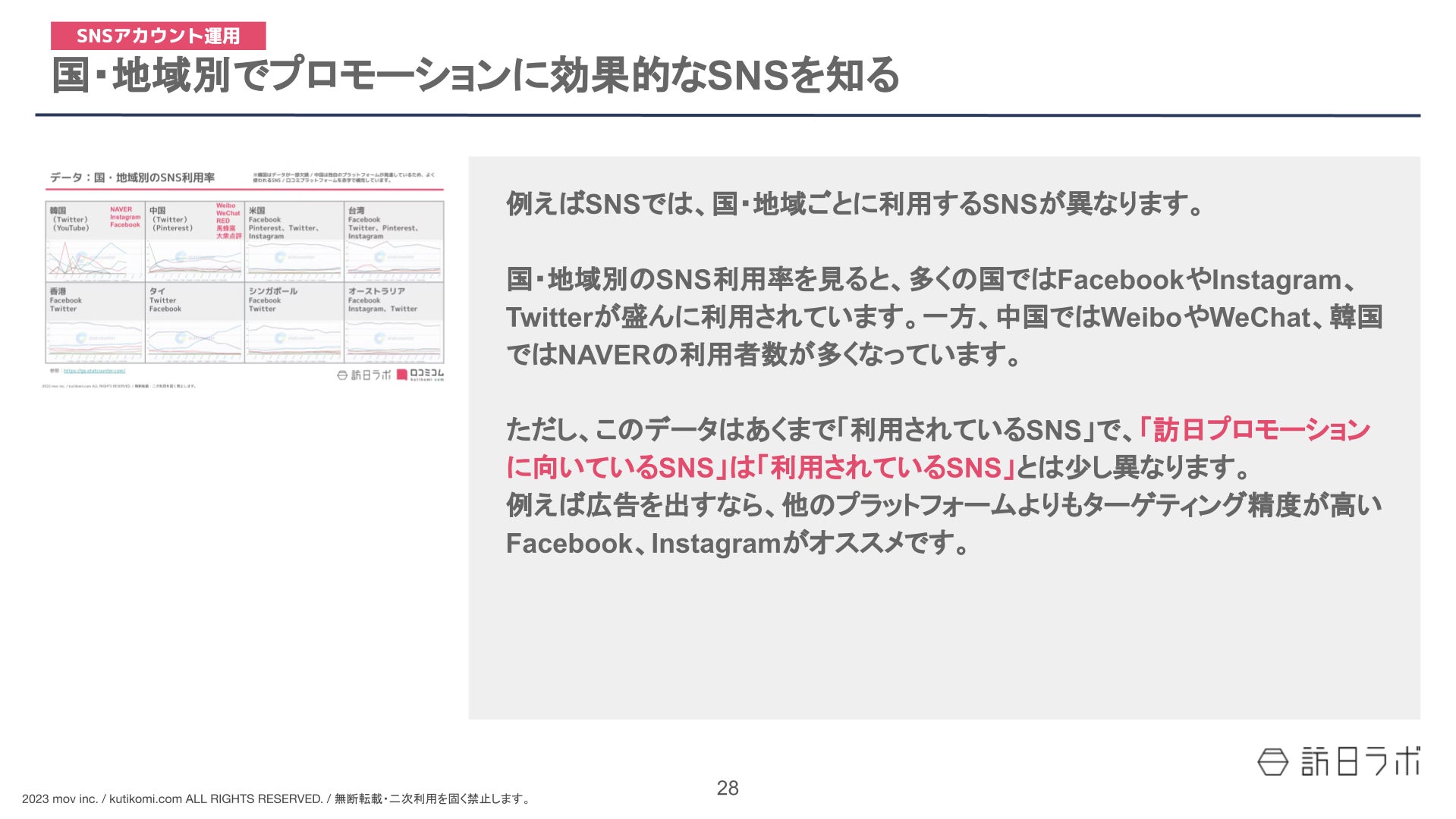 ただし、このデータはあくまで「利用されているSNS」で、「訪日プロモーションに向いているSNS」は「利用されているSNS」とは少し異なります。
