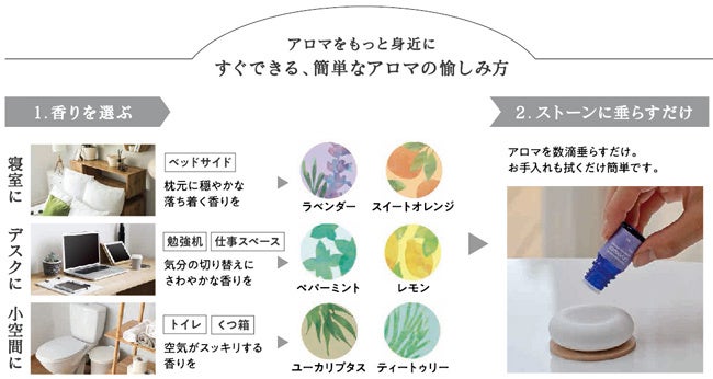 アロマストーンにエッセンシャルオイルを数滴垂らすだけで、安らぎの空間に。