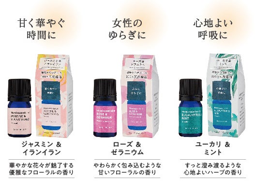 全6種:ラベンダー&オレンジ、ローズマリー&レモン、ヒノキ&オレンジ、ジャスミン&イランイラン、ローズ&ゼラニウム、ユーカリ&ミント