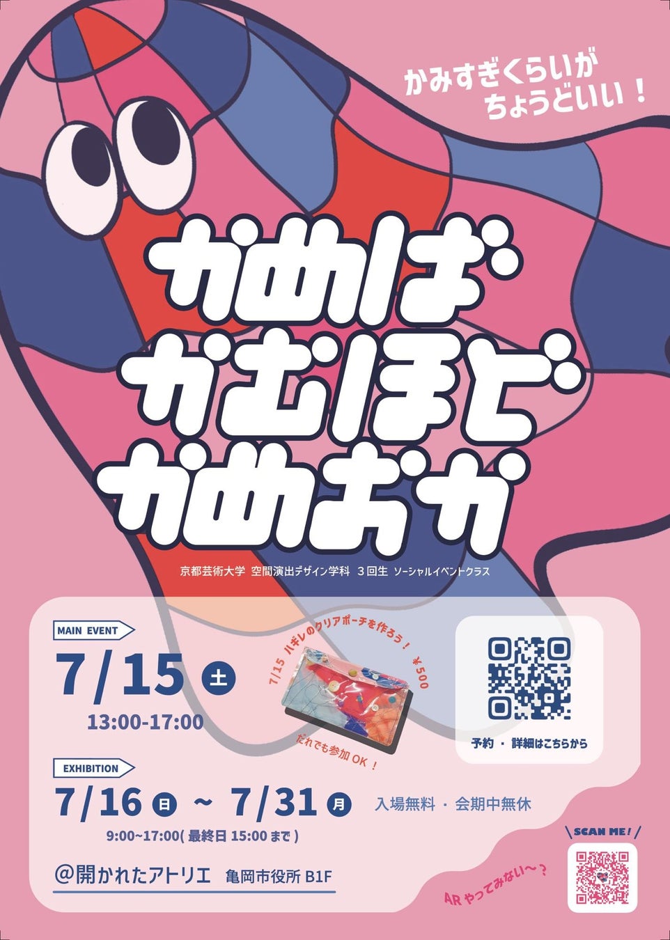 ・京都芸術大学の空間演出デザイン学科の3年生が「開かれたアトリエ」(亀岡市役所B1F)にてイベント「かめばかむほどかめおか」を開催。