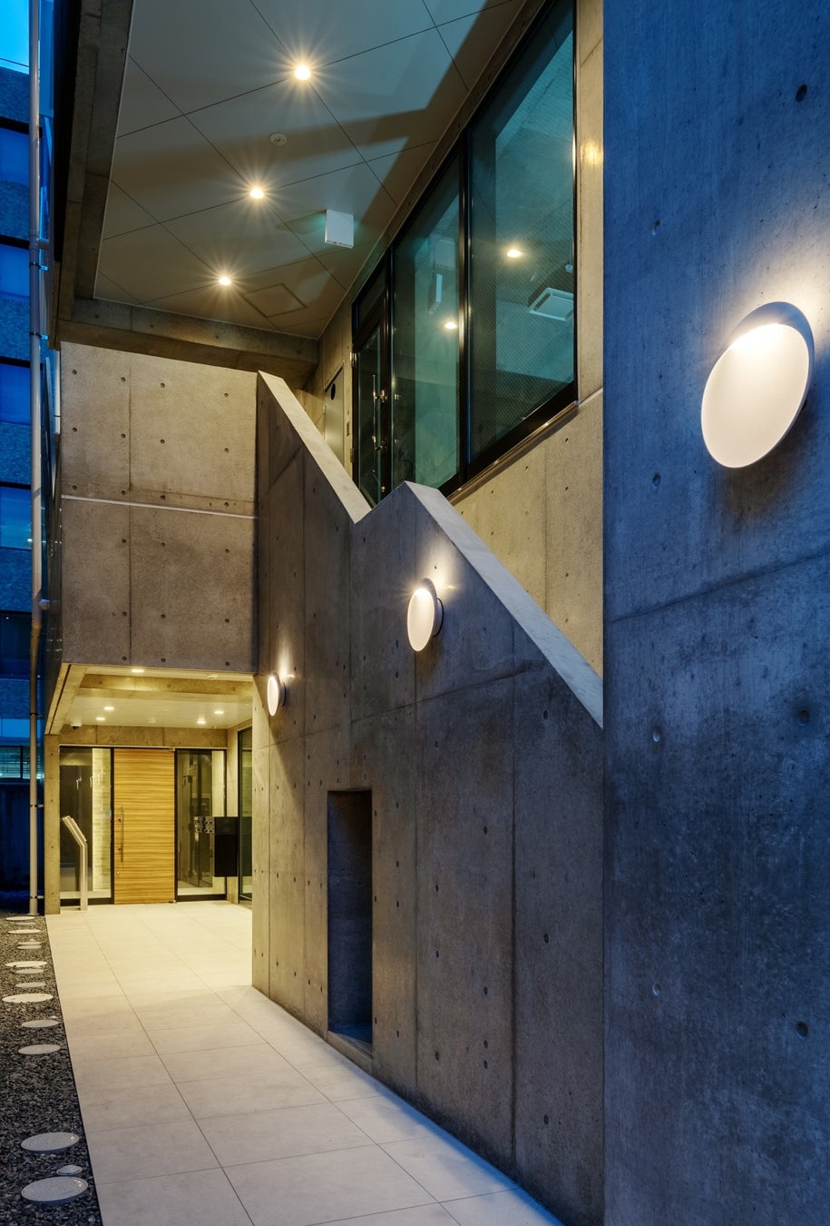 本ビルは鉄筋コンクリート造4階建で、1,2階部分にテナント出店が可能です。設計は有限会社藤坂建築デザイン工房(代表取締役:藤坂浩匡/本社:岡山県岡山市)が担当。岡山市北区中山下は岡山市の中心市街地であることから『地域全体がトレンドの発信拠点となるようなシンボリックな建物』を設計コンセプトに打放しのコンクリートやガラスのカーテンウォール、凹凸のある造りが特徴的な外観に仕上がりました。