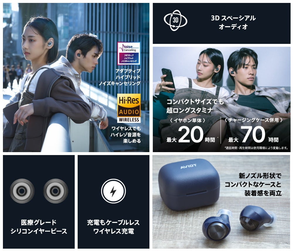 コンパクトかつ軽量なデザインでありながら、本体のみで最大約20時間、ケース併用で最大約70時間の連続再生を実現。ワイヤレス充電にも対応し、煩わしい充電の手間を大幅に削減。さらに、シーンに合わせて騒音抑制の強度を調整するアダプティブハイブリッドノイズキャンセリング機能、ハイレゾ再生を実現するLDACにも対応。AVIOT独自のサウンドチューニングで、ナチュラルにクリアに、ジャンルを選ばず、聴き疲れなく長く楽しめるサウンドに仕上げています。また、3Dスペーシアルオーディオを使用すれば、まるでステージが広がるような臨場感を楽しめます。通勤・通学の日常使いにはもちろん、音楽や動画鑑賞に浸りたい時にも、十分な機能性でそれを叶えてくれる一台です。