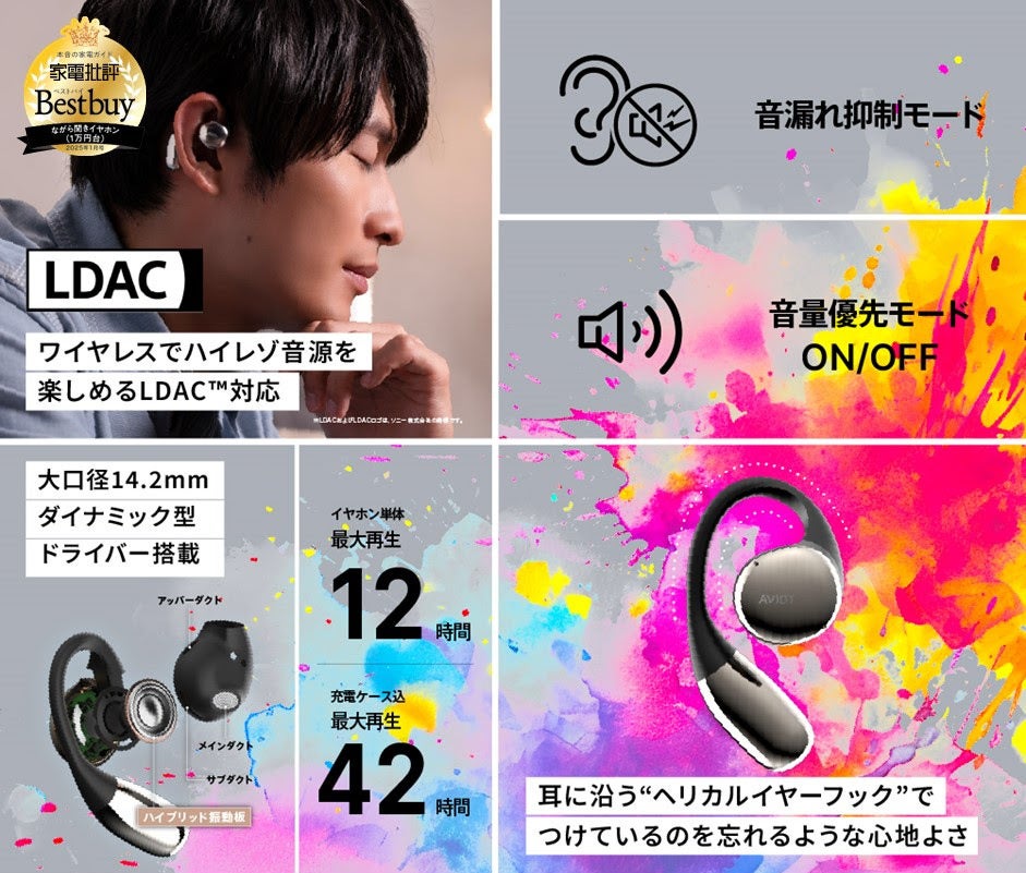 耳をふさがずに音楽を楽しめるオープンイヤー型ワイヤレスイヤホン。マルチダクト構造により、周囲の音を自然に取り込みつつ、しっかりとした音圧と臨場感あるサウンドを実現。最大約42時間の再生に対応し、日常使用からスポーツ、ビジネスシーンまで幅広く活躍します。オープンイヤー型でストレスの少ない装着感を実現しながら、AVIOTならではの高音質を追求したモデルです。