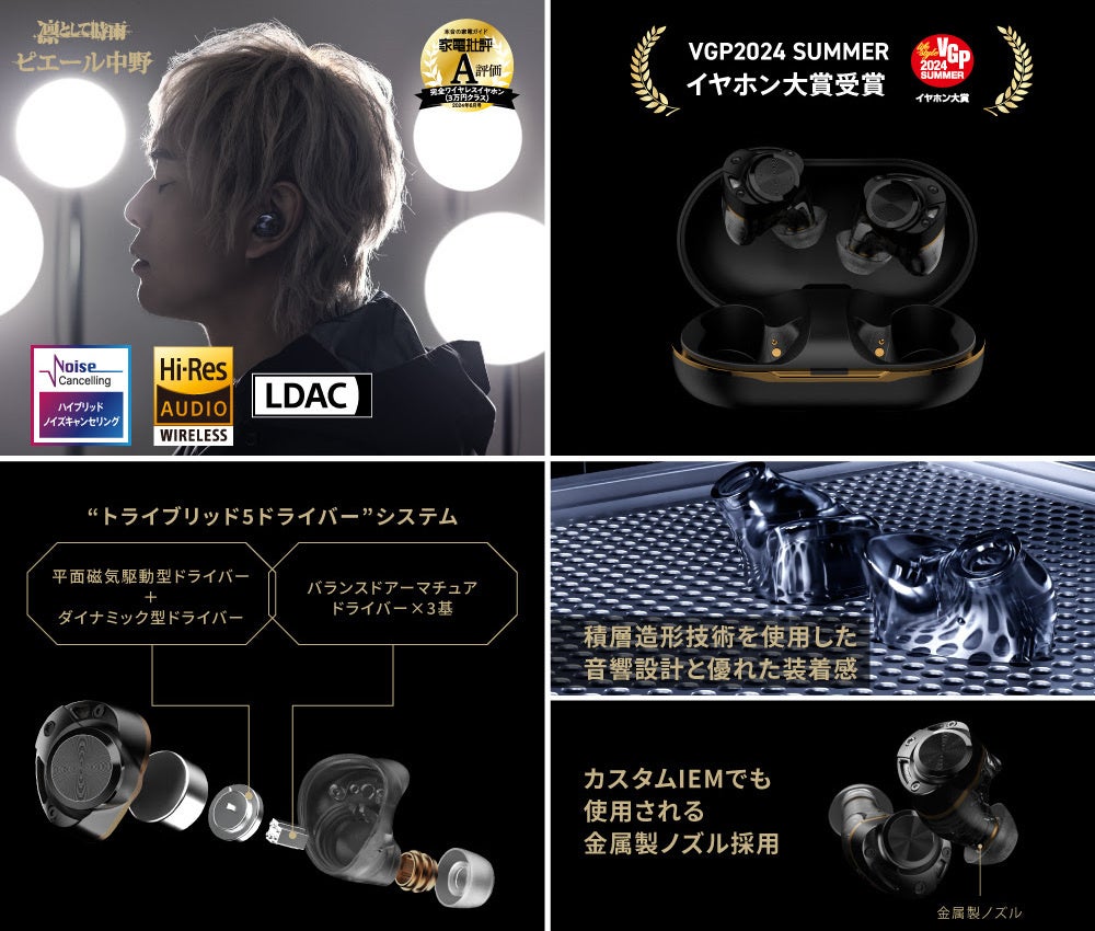 「VGP2024 SUMMER」にて、有線イヤホンも含めた全イヤホンの大賞である”イヤホン大賞”を受賞。ピエール中野氏完全監修。完全ワイヤレスイヤホン史上初*1、3種5基からなる新開発ドライバーシステム“トライブリッド5ドライバー”システムにより、圧倒的な情報量を誇る、かつてない高音質を実現したAVIOTのフラグシップモデル。積層造形技術による音響設計と優れた装着感、金属製ノズルによる高硬度・高比重・高精度な音道造形をはじめ、これまでに同ブランドが培った数々の技術を余すところなく投入した完全ワイヤレスイヤホン。ハイブリッドノイズキャンセリング、ハイレゾ再生にも対応し、音響性能、デザイン、機能性をすべて備えた一台です。