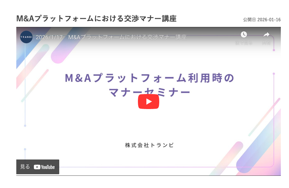 TRANBIは、M&Aにおける「安心・安全なM&Aインフラ」として、当事者間のリテラシー向上とモラル啓発に継続的に取り組んでまいります。本取り組みを通じて、オンラインM&A市場全体の健全な発展に寄与してまいる所存です。