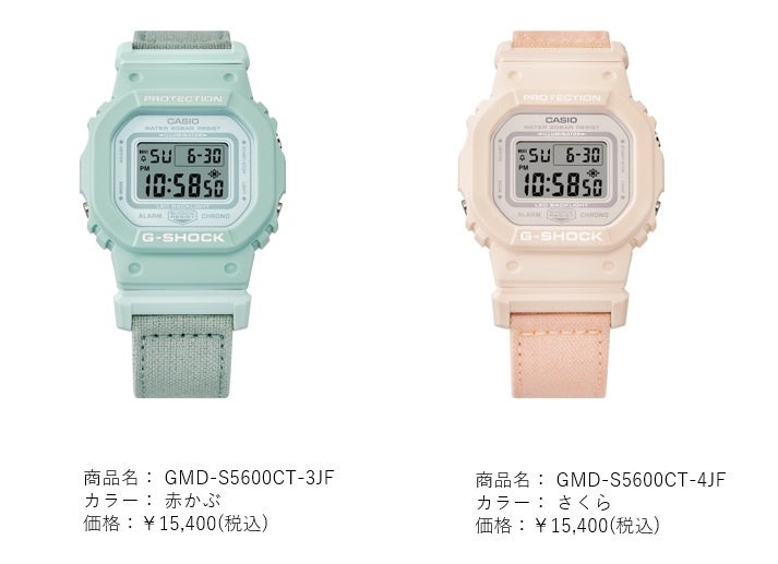 今回の商品染色の原料として、“赤かぶ”はすんき漬けで使用されている葉に対して余る実の部分、“さくら”は食用で塩漬け加工され古くなったものを使用しています。食材由来だからこそ表現できる優しい色合いとなっており、赤かぶが「GMD-S5600CT-3」、さくらが「GMD-S5600CT-4」として、1月中旬からCASIOオンラインストア限定で販売されています。
