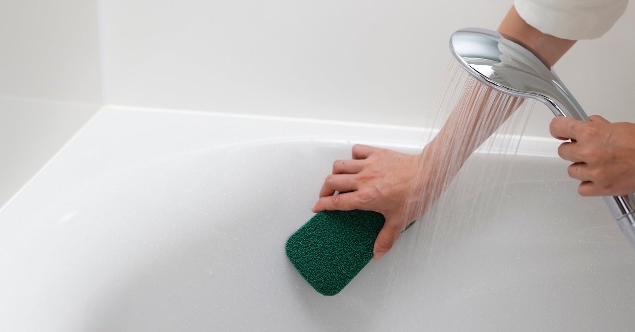 カラーは空間になじむグリーンとグレーの2色を採用。「ハード加工面(濃色)」でがんこな汚れを、「アクリル面(淡色)※ 」でデリケートな場所を。しつこい汚れも傷付きが気になる場所も隅々まできれいに洗えます。