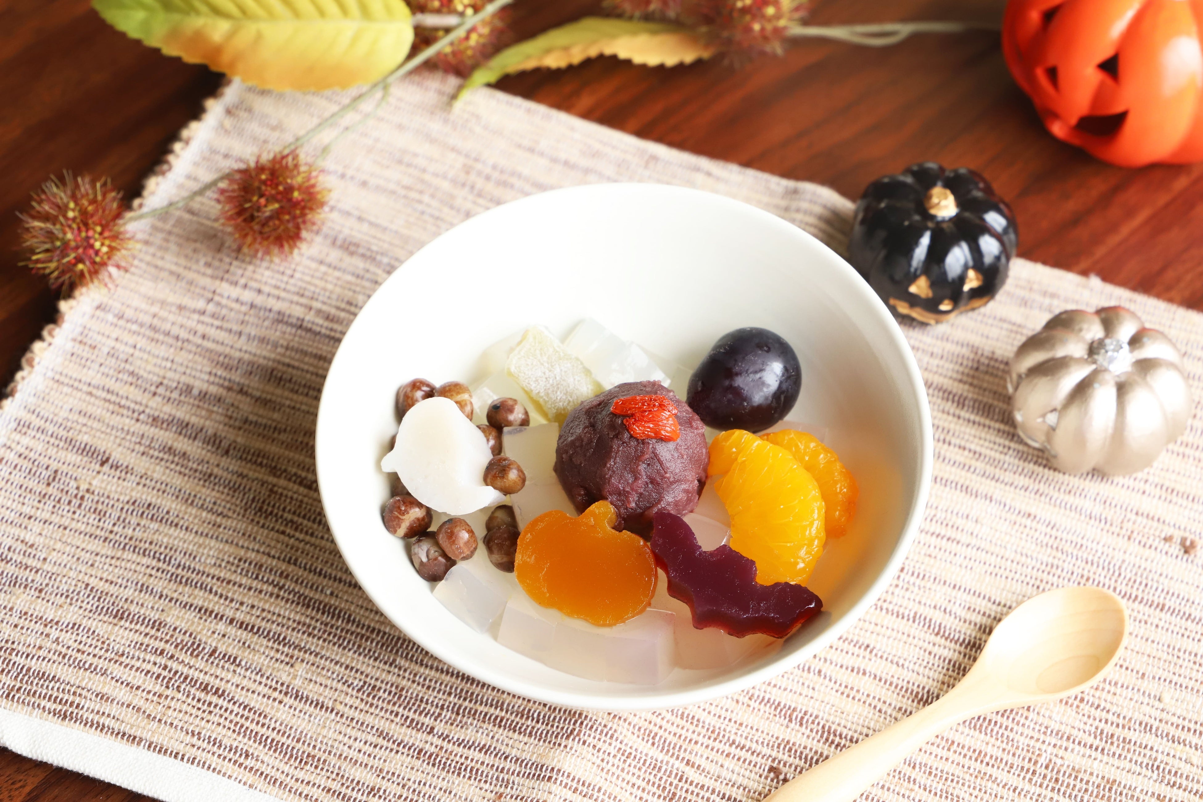 ベースはコリっとした食感が特徴の寒天とあんこ職人こだわりのこし餡、北海道産の赤えんどう豆といった船橋屋定番の具材。そこにおばけ型のくず餅やかぼちゃ羊羹、コウモリ寒天を添えたハロウィンならではの期間限定のあんみつです。みかんやぶどうも加えることでフルーティーな味わいをお楽しみいただけます。