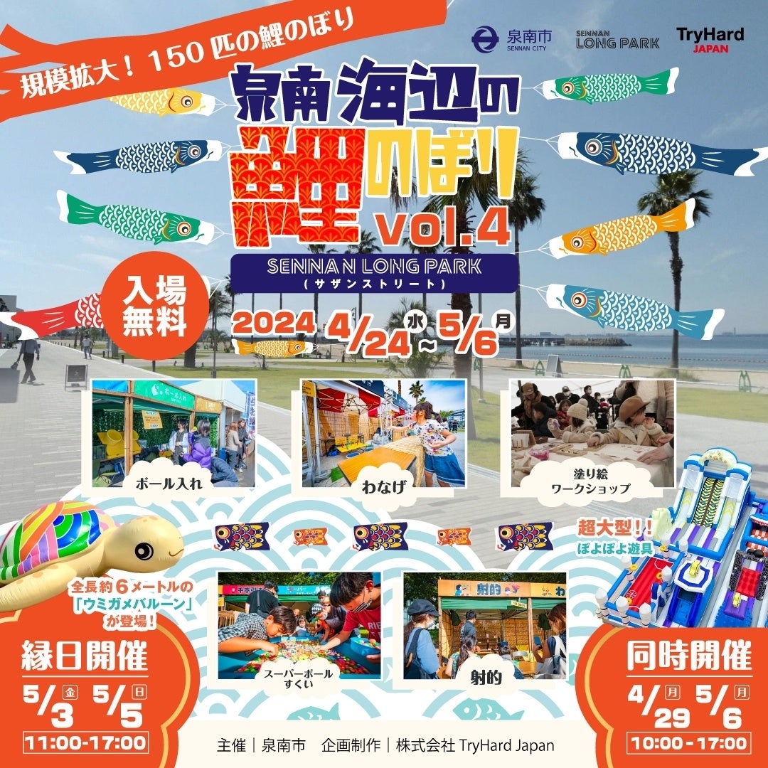 泉南市と株式会社TryHard Japan(所在地:大阪市中央区)は、泉南市のシティープロモーションの一環として、2024年4月24日(水)から5月6日(月・祝)の期間中、SENNAN LONG PARK(センナンロングパーク)にて「泉南海辺の鯉のぼり vol.4」を開催いたします。今年で4回目となる本企画は、泉南市の名所「タルイサザンビーチ」をバックに、大小様々な鯉のぼりを展示し、子供たちの健康と成長を祈る春の特別企画です。今年はなんと、昨年の1.5倍、150匹の鯉のぼり達が皆様をお迎えします! また、ゴールデンウイーク期間中の5月3日(金)から5月5日(日)には、毎年お子様に大人気の全長6mの巨大ウミガメバルーンの展示をはじめ、誰でも無料で楽しめる鯉のぼりの塗り絵ワークショップや、お祭り気分が味わえるこども縁日やフードトラック、そして全長15mの超巨大ぽよぽよ遊具がやってきます!爽やかな潮風吹くSENNAN LONG PARKで、家族団欒の楽しいひと時をお過ごしください。