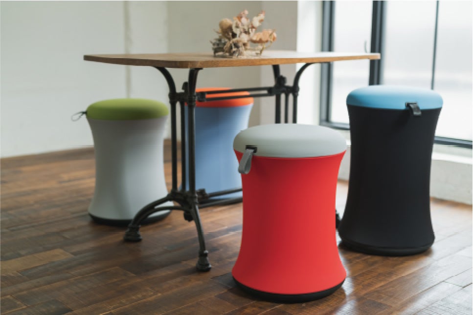 ◆高さ調節によって伸縮する張地と、座面が傾くチルティング機構が特徴のスツール