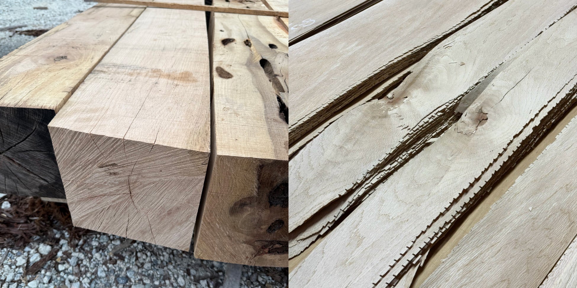 正面什器以外の壁面棚や中央什器の表層部分には、突板を使用しています。これは、角材を切り出したクヌギの周りの部分をスライスしたもの。大阪府八尾市で、世界中のさまざまな木材の化粧合板をつくられている、安多化粧合板株式会社さんに製作していただきました。