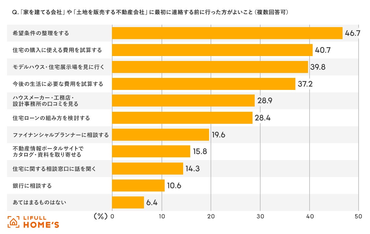 “家を建てる会社や不動産会社に連絡する前”に行った方がよいことを聞いたところ、「希望条件の整理をする」(46.7%)、「住宅の購入に使える費用を試算する」(40.7%)が多い結果となりました。