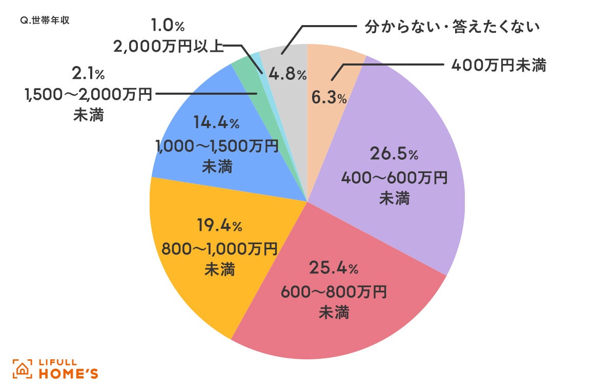 注文住宅の購入者で、年収のボリュームゾーンが最も多いのは400~600万円未満で「26.5%」。次いで、600~800万円未満が「25.4%」となりました。800万円未満の購入者が実に約6割という結果となりました。