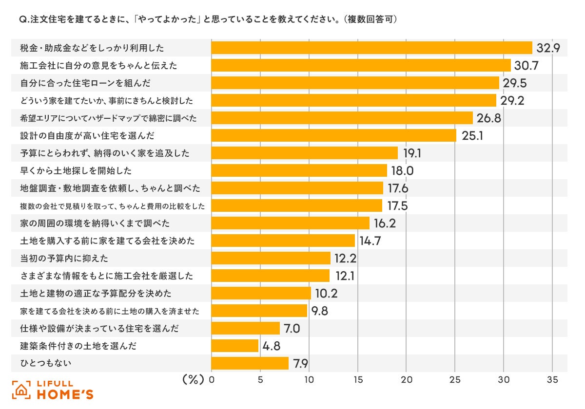やってよかったと思っていることの1位は「税金・助成金などをしっかり利用した」(32.9%)、続いて「施行会社に自分の意見をちゃんと伝えた」(30.7%)、「自分に合った住宅ローンを組んだ」(29.5%)となり、1位と3位にお金に関する項目がランクインしました。