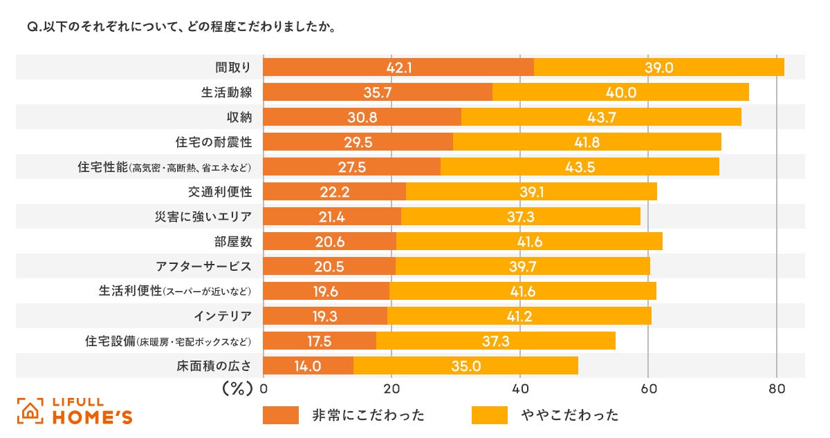 注文住宅を建てるうえで、非常にこだわったポイントは、「間取り」が42.1%で最も高くなりました。次に多かったのが「生活動線」(35.7%)、「収納」(30.8%)で、日々の暮らしに密接な部分にこだわったことがうかがえます。