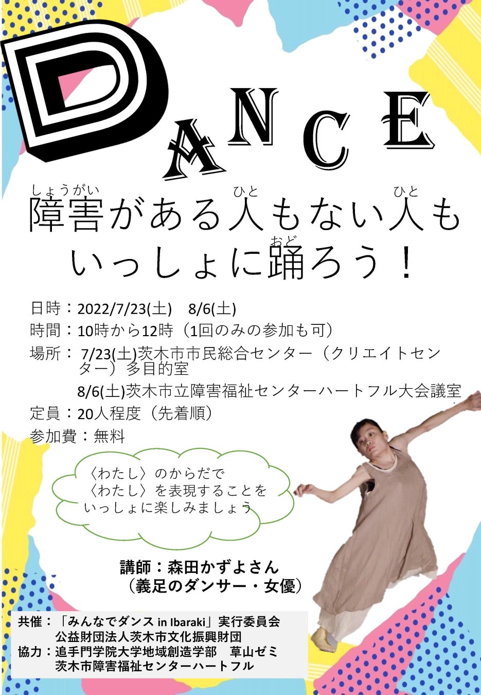 障害のある人もない人もダンスという共通の身体表現を通じて相互理解をはかろうというワークショップを、追手門学院大学(大阪府茨木市、学長:真銅正宏)で共生社会を学んでいる学生らが、7月23日と8月6日に茨木市内で開催します。