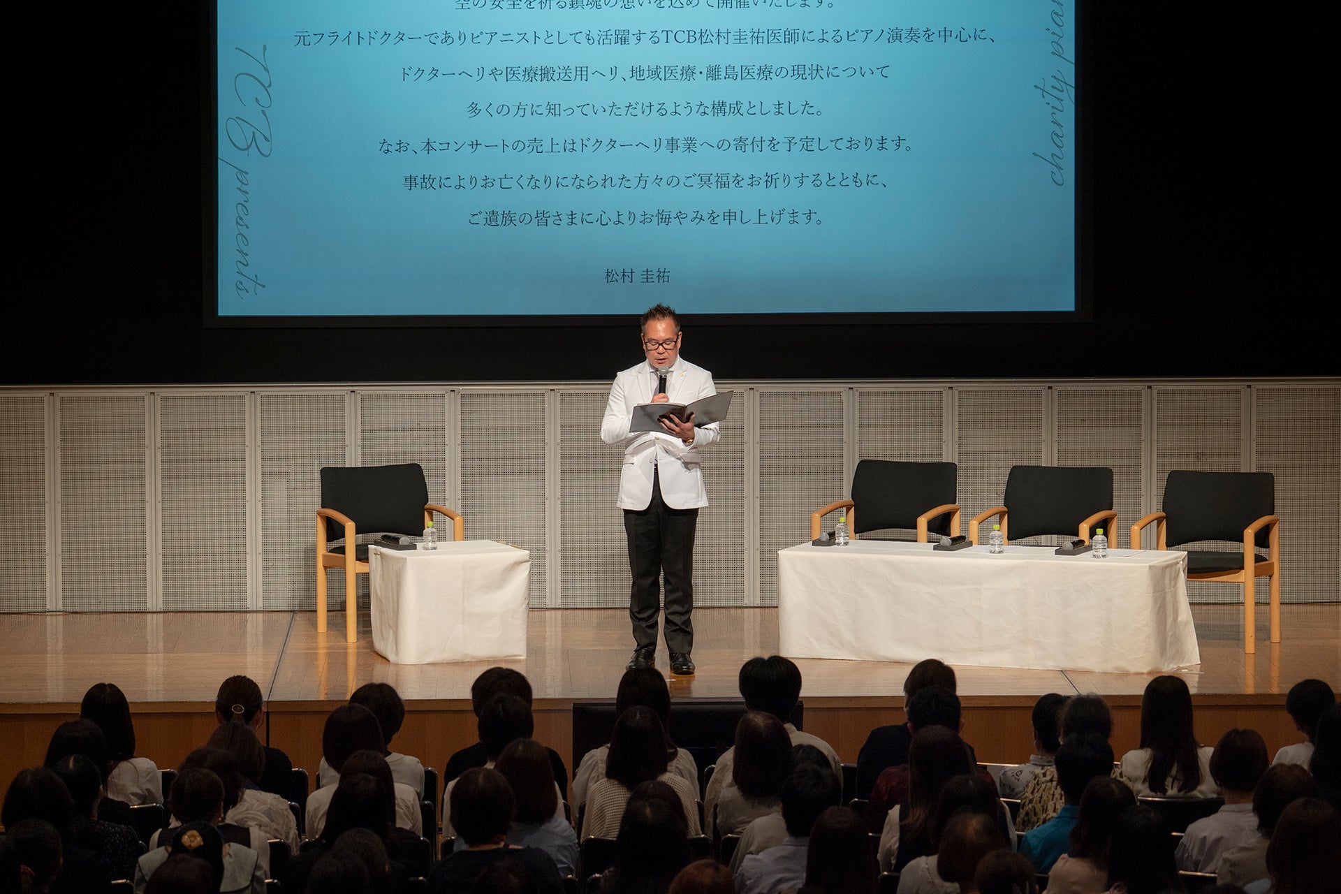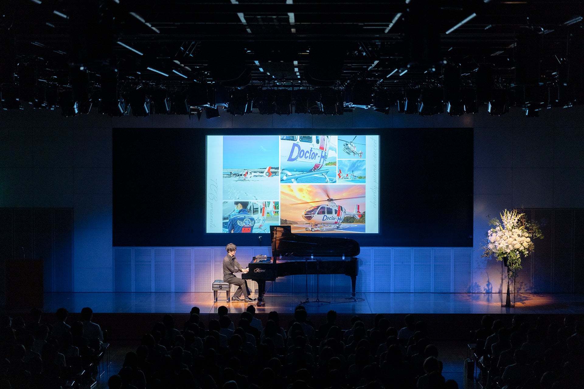 元フライトドクターである松村圭祐医師によるピアノ演奏を中心に、ドクターヘリや医療搬送用ヘリ、地域医療・離島医療の現状について多くの方に知っていただけるような構成としました。