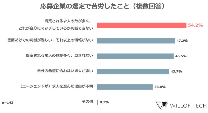 応募企業の選定で苦労したことの1位は「提案される求人数が多く自分に合う求人がわからない」