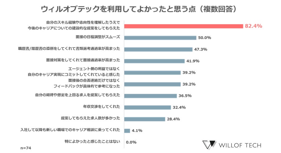今回の調査により、ITエンジニアが転職活動において最も苦労するフェーズは「職務経歴書・履歴書の作成」であること、転職エージェントに対しては「紹介する求人数を20件以内に絞って欲しい」という要望、「エンジニアのスキルに対する深い理解」を求める傾向がわかりました。ウィルオブテックでは、エンジニア技術に関する豊富な知識を持ったエージェントの育成や、厳選した求人紹介に取り組んでいます。利用者を対象に実施したアンケートでも、8割以上の利用者からスキルに対する理解度について高く評価をいただいており、今後もITエンジニアのスキルとキャリアに寄り添った転職をサポートしてまいります。