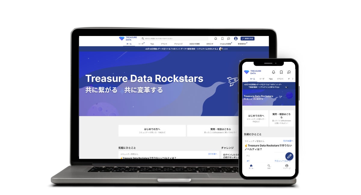 「Treasure Data Rockstars」は、顧客データ活用サービス「Treasure Data CDP」のユーザーコミュニティです。ユーザー同士が顧客データを活用する中で得た知見を共有し合えるほか、抱えている課題について相談したり、関連する有益な情報を得たり、様々なシーンでご活用いただけます。