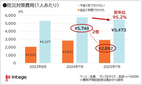 ・過去1年間の支出は2,892円に微増も、今後かけたい費用は前年比95.2%。物価高や防災意識の薄れが要因か
