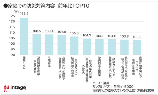 ・対策内容は「簡易トイレ」(前年比123.6%)、「避難所を確認・家族で共有」(108.5%)、「生理用品」(108.4%)などが進展