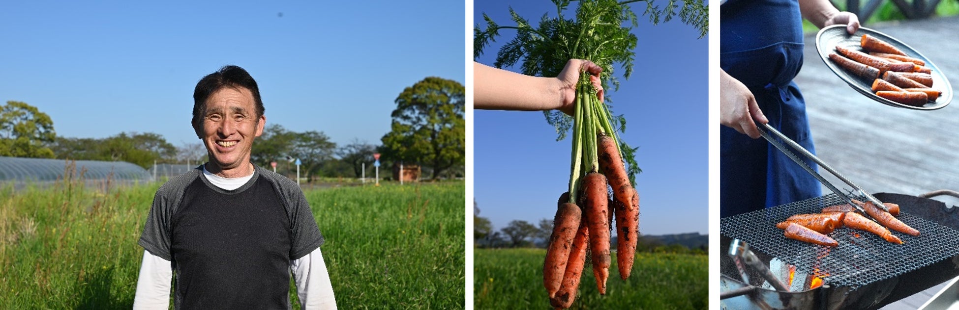 松井農園は、緑豊かな山あいと清らかな湧き水に囲まれた綾町の環境の中で、創業以来一貫して有機農法にこだわり続けてきました。化学肥料や農薬を使わない栽培を約25年前に地域でいち早く導入し、土づくりから始める先駆的な取り組みを現在も続けています。主力作物の有機人参「黒田五寸」は、皮まで薄く柔らかい食感と、生でかじっても感じられる土の甘みが特徴です。