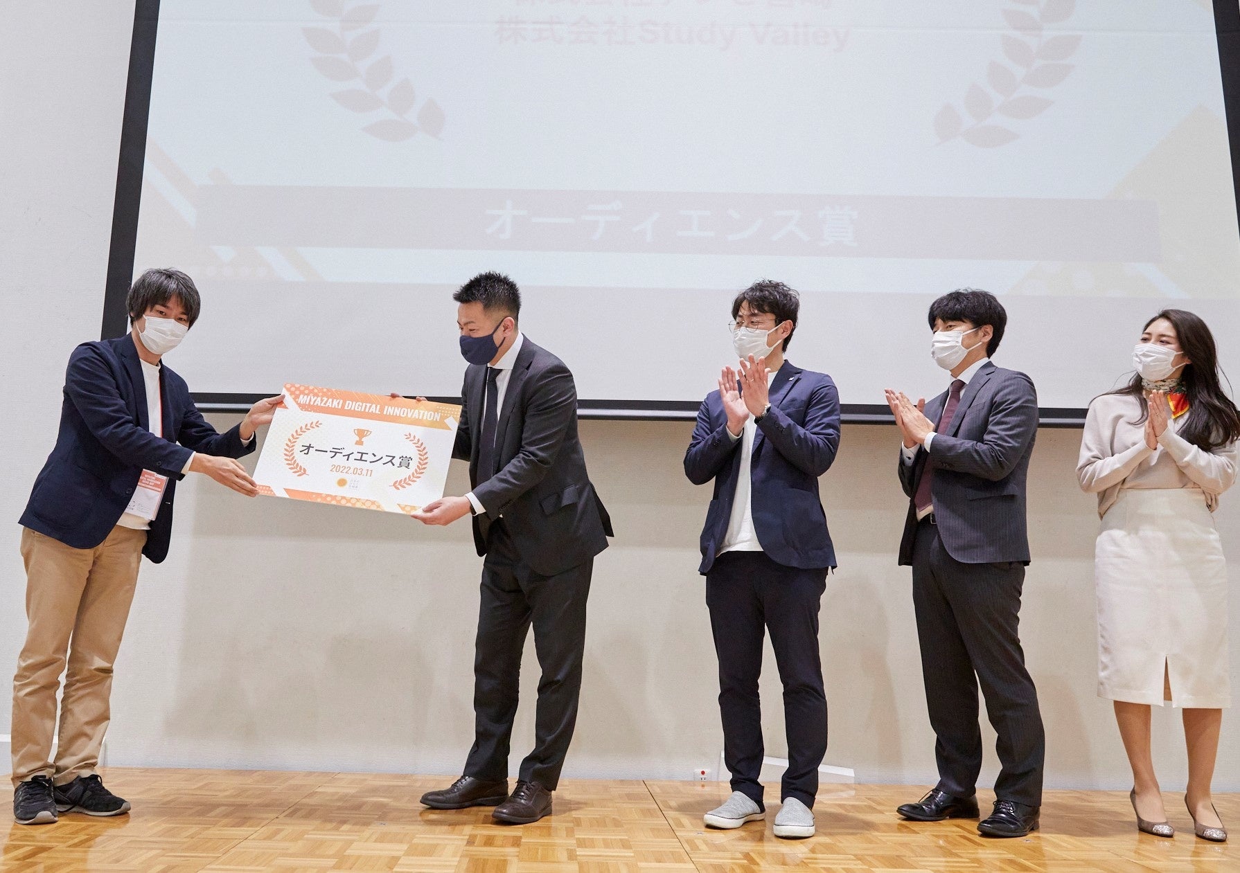 当日は、「宮崎県で地域課題と向き合ってきた地場企業」と「全国のスタートアップ」の共創によって生まれた計6チームが約3か月間の共創成果を発表し、結果、株式会社テレビ宮崎と株式会社Study Valleyによるプロジェクト「地域に根差した探求学習を用いた新しい地域価値創造」が、参加者の支持をもっとも集めた「オーディエンス賞」を受賞しました。