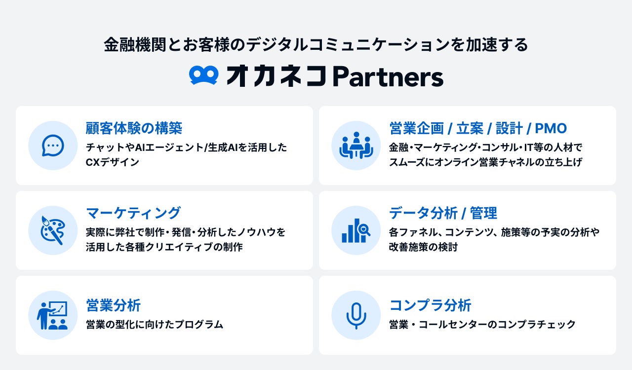 『オカネコPartners』は、家計診断・相談サービス『オカネコ』で培った知見をもとに、金融機関や金融サービスプロバイダーに対してユーザーとのコミュニケーション最適化を支援する事業です。チャットや生成AIを活用した顧客体験設計から、オンライン営業チャネルの立ち上げ、マーケティング施策の実行、データ分析・改善、さらには営業プロセスの最適化やコンプライアンスチェックの自動化まで、幅広い領域をワンストップで支援します。金融・マーケティング・ITのプロフェッショナルによる実践的なノウハウを活かし、金融機関のDXを推進します。