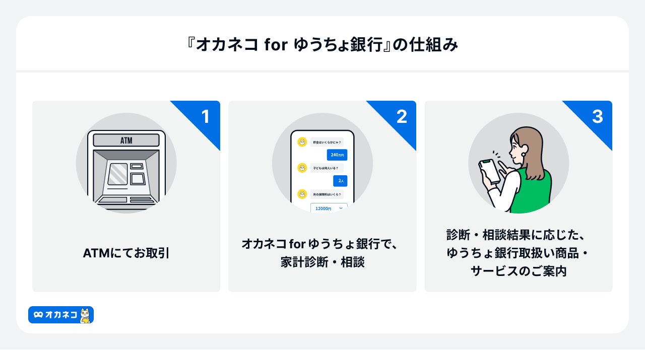 今回の実証実験では、この『オカネコ』の仕組みを活用し、全国のローソン店舗に設置の ローソン銀行ATM(※2)利用後のお客さまをスムーズにゆうちょ銀行のサービスへご案内する顧客導線を400Fが構築します。これにより、利用者一人ひとりに応じた金融情報をお届けできる可能性を検証いたします。
