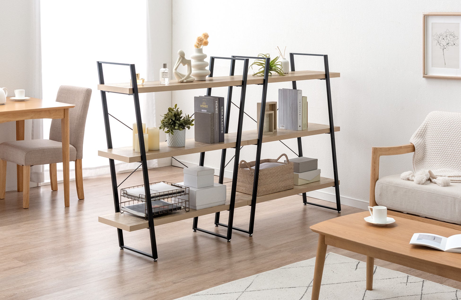 「2wayオープンシェルフ」はシンプルなデザインにより、キッチン、リビング、脱衣所などお部屋のあらゆる場所でご活用いただけます。収納スペースとしての実用性はもちろんのこと、インテリアとしても映えるディスプレイ機能も兼ね備えています。また、上下のフレームを組み合わせた並列設置にも対応しており、間仕切りとして活用しながら大容量の収納を確保しつつ洗練された空間を演出できます。
