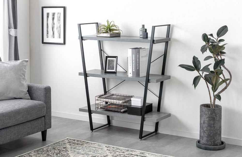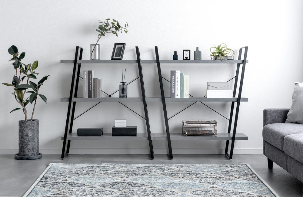 ブラックフレーム×木目調・モルタル調の天板がシンプルながら素材感を演出!上下逆さに配置可能な構造で、並べる楽しみがあるシェルフが誕生しました。