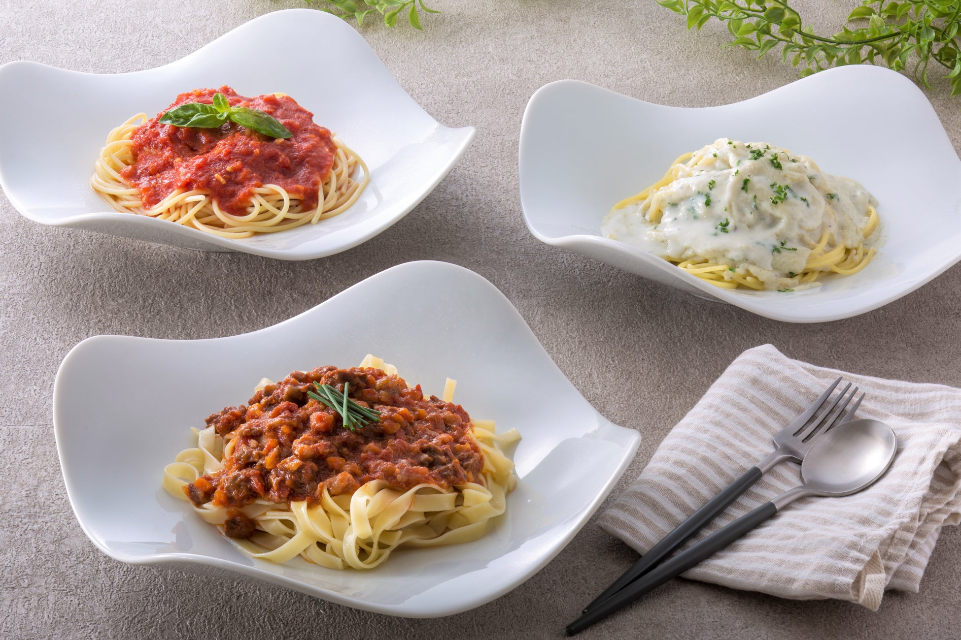 お好みのパスタに和えるだけでお召しあがりいただけるパスタソース3種をご用意いたしました。同じソースを3品でも、3種類を1品ずつでも、組み合わせは自由です。