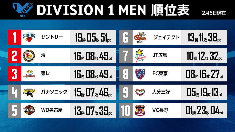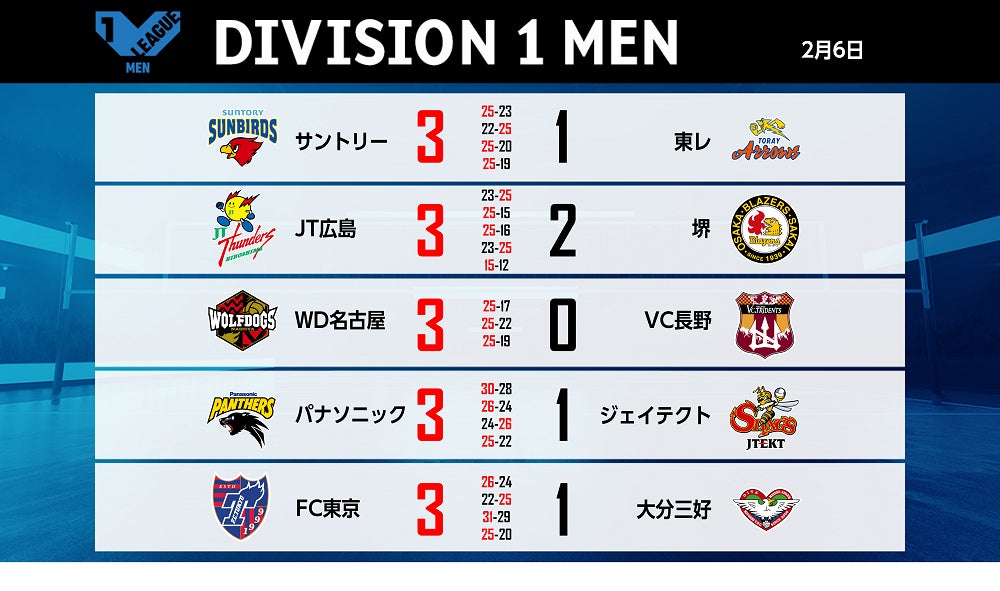 【バレー/Vリーグ】V1男子・サントリーが2連勝で首位を譲らず。全チームがホーム2連勝する形に