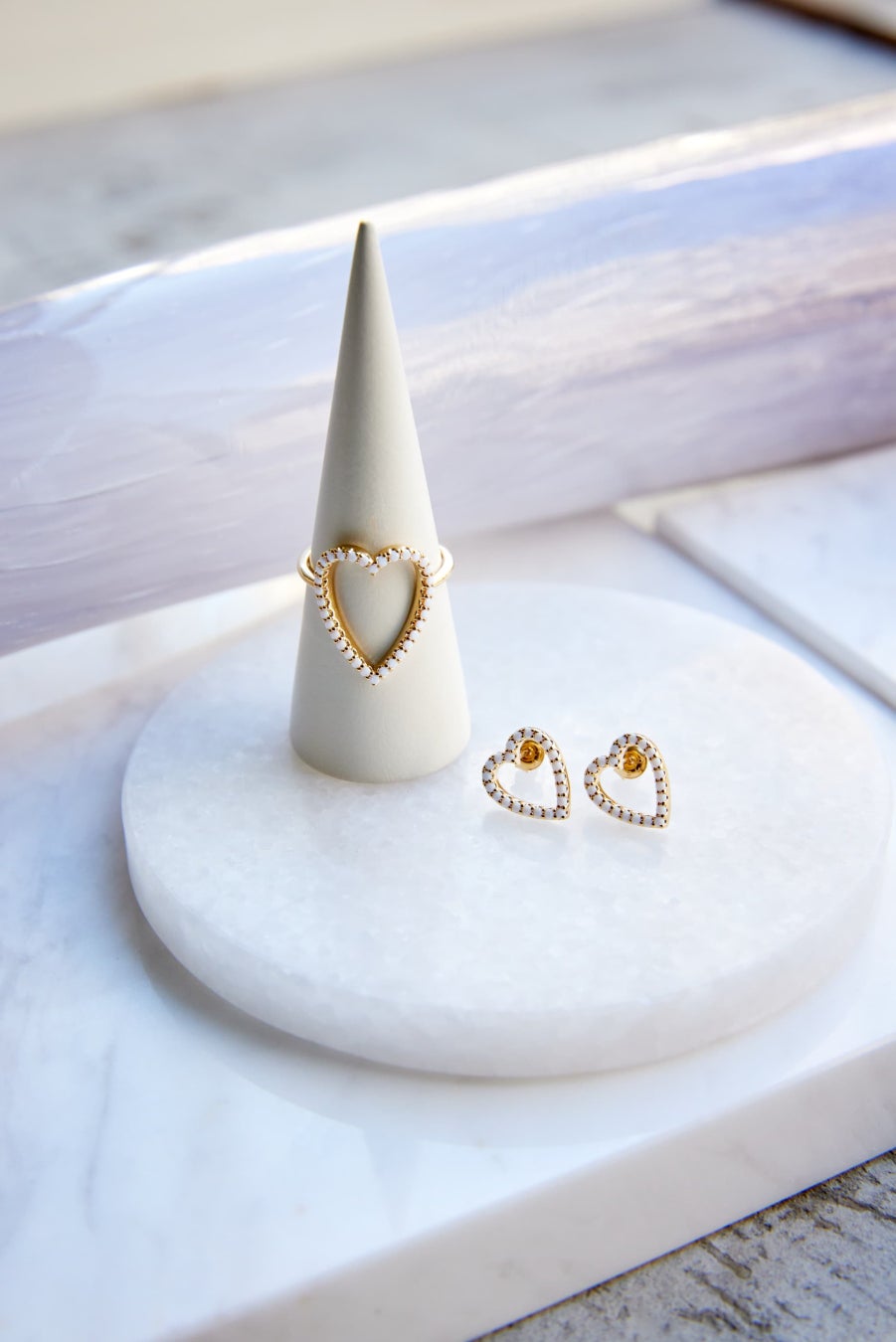 リングは着用時に指が長く見えるよう、アームをモチーフの上部に配置。縦長のオープンハートから指が覗き、抜け感のあるデザインです。