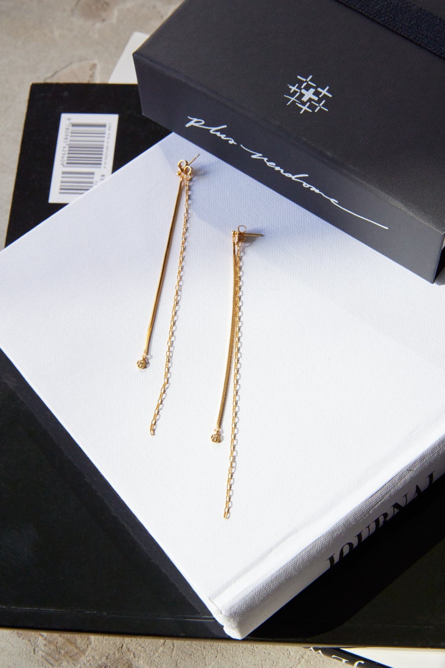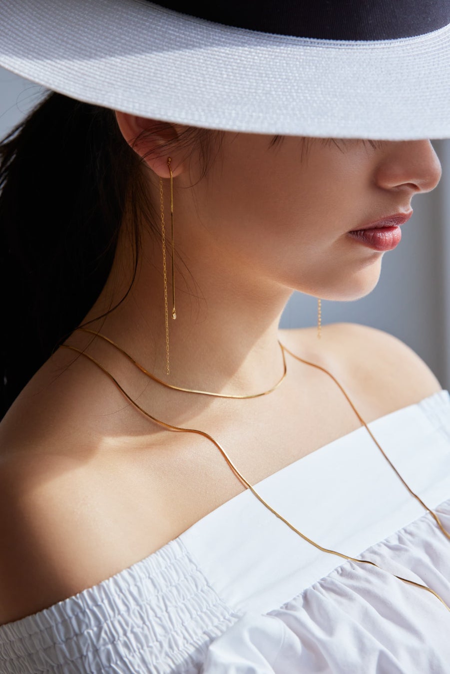 角スネークと呼ばれるチェーンは、エッジがありながらも程よいメタル感が特徴。SILVER925のチェーンにK18イエローゴールドコーティングを施しています。耳たぶを挟んだ背面には、細いコマをつなげた抜け感のあるチェーンを採用し、異なるチェーンを合わせることでお顔まわりに 輝きと立体感を演出してくれます。